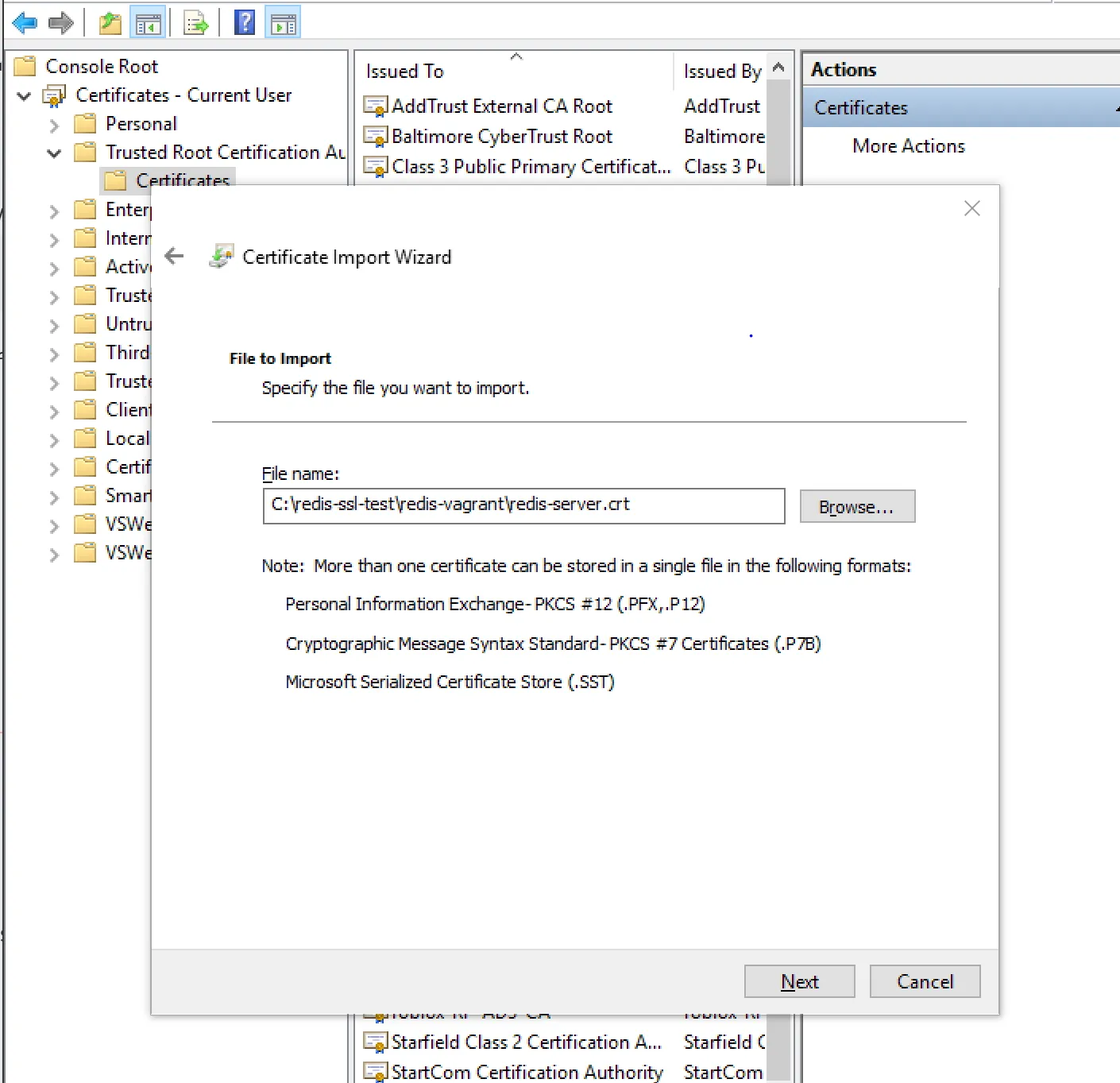 - A new dialog will show, click on Next and then Browse for your certificate file.